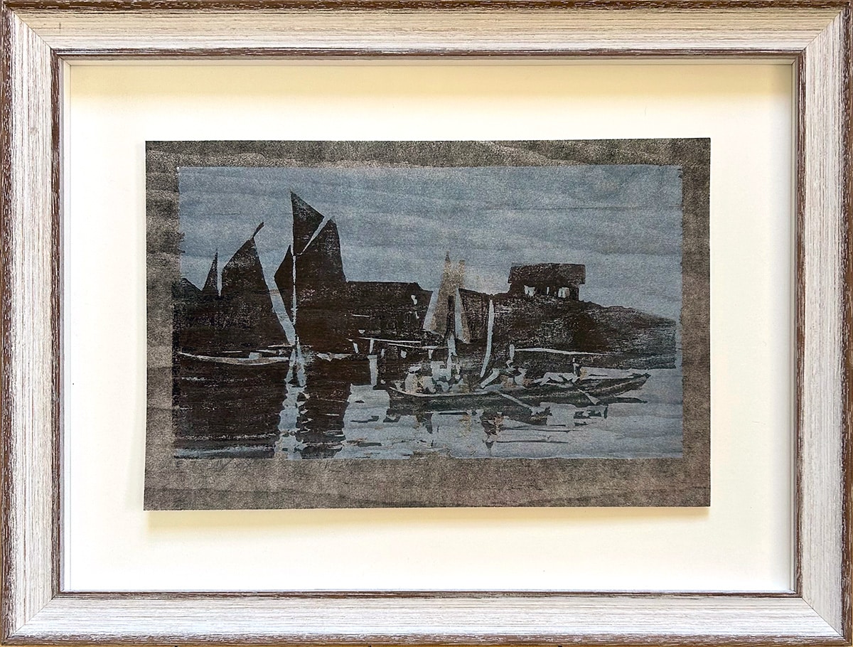 Detta färgträsnitt av Lars Lerin visar segelbåtar i en stilla hamn där ljus och skugga möts i en dämpad och poetisk färgskala.