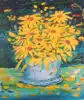 Färgglad litografi av Plura – gula blommor i blå vas mot blågrön bakgrund.